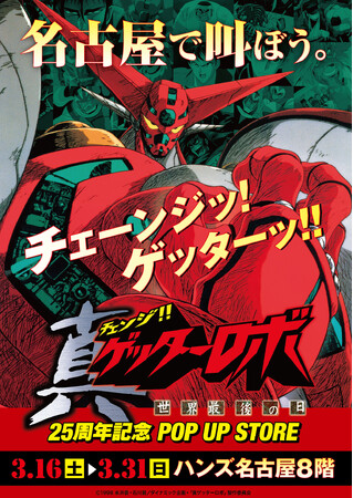2024年3月16日(土)~3月31日(日)愛知県・名古屋市「ハンズ名古屋店」にて、1998年公開の『ゲッターロボ』シリーズ初のOVA作品『真(チェンジ!!)ゲッターロボ 世界最後の日』25周年を記念し、いま改めて当時の熱狂と興奮、そして破壊的異端ぶりを振り返るPOP UP STOREを開催!