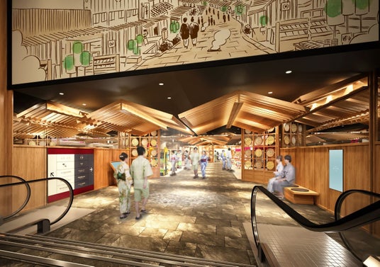 店内は、湯けむり立ち昇る街並み情景を感じることができる空間へリニューアル。床は木目、通路は小路の石畳を表現しており、通路と売り場を明確に分けるデザインを使用しています。また、湯けむりをイメージした照明などを設置。大切な人との会話を楽しみながら、買い物をお楽しみいただける空間をご提供。「杉乃井パレス」正面玄関を入ると、町屋の一角で一息つくことができる憩いの場も設けています。