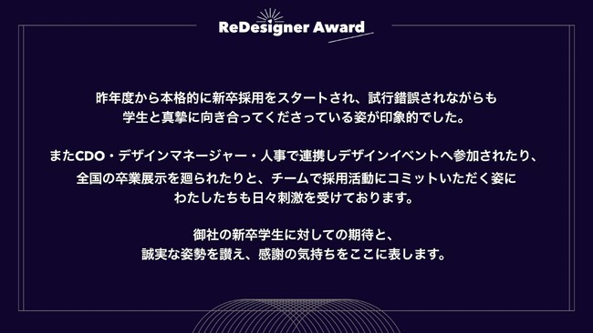 この度は賞をいただきまして、誠にありがとうございます!昨年までの中途メインの採用と異なり、初めての新卒採用はわからないことだらけでした。そんな中、わたしたち企業にも、学生の方にも心の底から親身にサポートしてくださるReDesignerのみなさまを見て学ばせていただくことがたくさんありました。本当にありがとうございます。