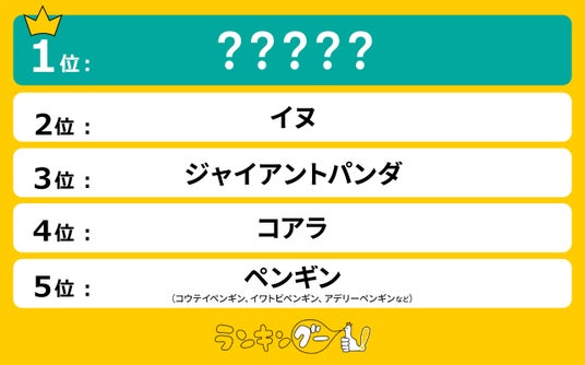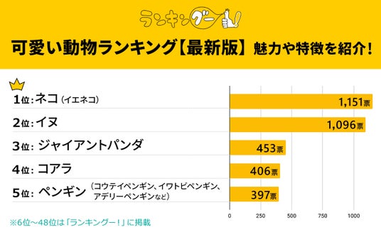 ランキングー!では可愛い動物をピックアップし、ランキングを調査。全年代の男女(性別回答しないを含む)10,064名にアンケートを行い、同率票を含むTOP48を決定しました。ここではTOP5をご紹介します。