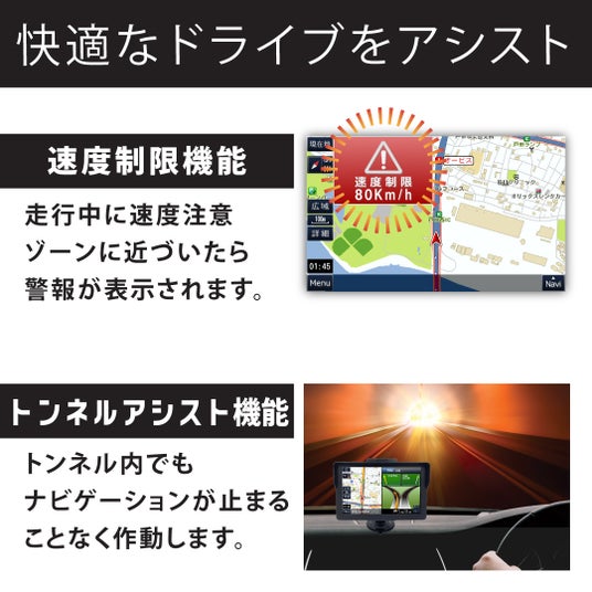 一方通行表示やトンネルアシスト機能、速度注意ゾーンに近づいたら警報が表示される速度制限機能や速度取り締まりエリアのオービス情報等、地点に合わせた支援情報を表示します。