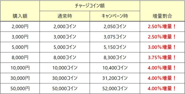 内容: 期間中、とらコインSHOPでのとらコイン購入額に応じて、チャージコイン額を最大4%増量します。