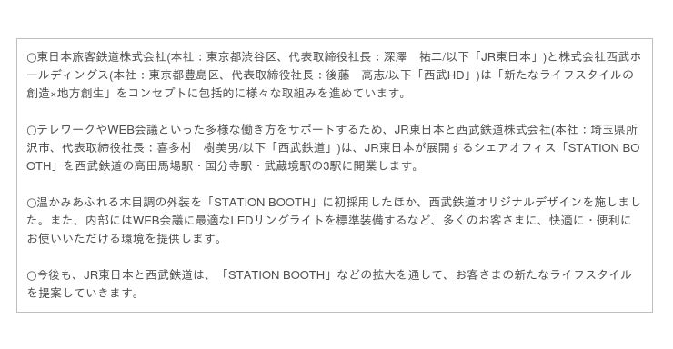 その連携施策の一つとして、時間や場所にとらわれない働き方、自分らしく働ける環境整備のため、西武グループ施設等へSTATION WORK を拡大させてまいります。
