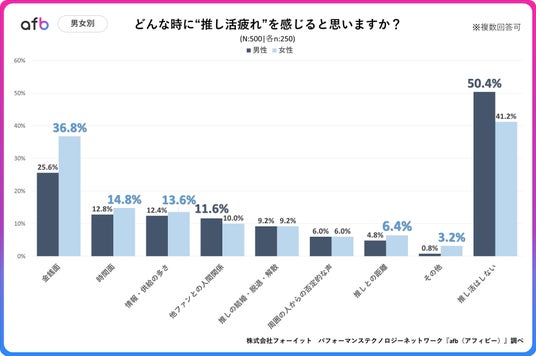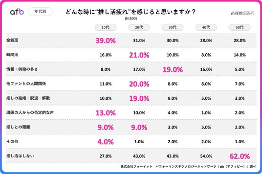パフォーマンステクノロジーネットワーク「afb(アフィビー)」< https://www.afi-b.com/ >の開発運用をおこなう株式会社フォーイットは、全国の10代~50代までの男女500人を対象に推し活に関するアンケートを実施し、年代別・男女別等の特徴についてまとめました。