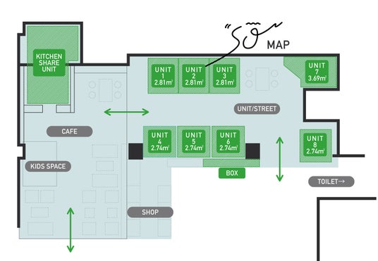 2. UNIT(8区画/1区画あたり 2.7~3.7平方メートル 程度 用途:販売・サービス・スクール等)