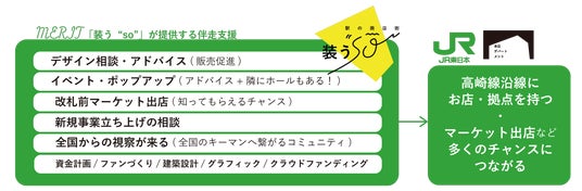 「装う“so”」は、活動を始めたい人が最初に小さく挑戦できる”入口”となる場所です。立ち上げ段階に応じての関わり方や支援を行い、熊谷駅という日常の場で活動を試し、磨いていくことができます。様々な関係性と実践を積み重ねていくための”ファーストチャレンジ”の場となることを目指しています。