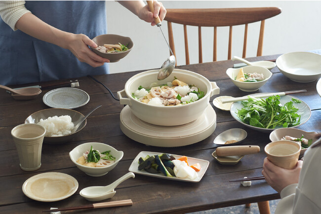 今回、各陶磁器産地の魅力を伝えるべく、三重県の四日市市で生産しているモダンな形とやさしい色味が好評の定番アイテム「スタイル 土鍋」に代わり、新作「十草彫り土鍋8号(1.8L)」が登場しました。また、土鍋と一緒に使える、「ろくべえとんすい」、「底平レンゲ・底平レンゲ受け」、「美濃焼 重ね釉茶碗」も同時に発売。食卓をもっと楽しくあったかに過ごせます。