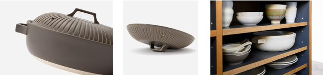 平らな底と、少し丸みを抑えたシンプルなフタはバランスが良く、特に使い勝手がいいフタは、取っ手が四角くなっているので、転がらずに置くことができます。また、火が通る前のかさばる食材にもしっかりフタができ、かつ収納時にかさばらない膨らみにもこだわりました。