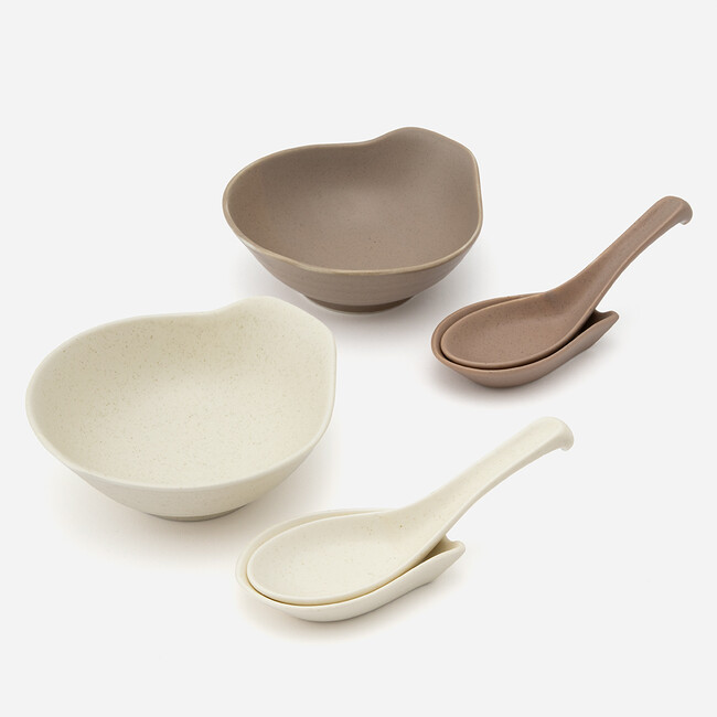 底が平らな面のあるレンゲとレンゲの受け皿です。こちらも十草彫り土鍋と相性良い同系色に仕上げました。レンゲとレンゲ受けを一緒にお使いいただくと、卓上でも置き場所に困らず、便利にお使いいただけます。
