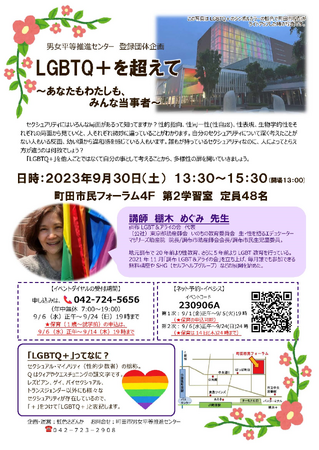 9月30日(土)に町田市民フォーラムにて、男女平等推進推進センター登録団体「虹色さざんか」が企画・運営する講座「LGBTQ+を超えて~あなたもわたしも みんな当事者~」を開催します。