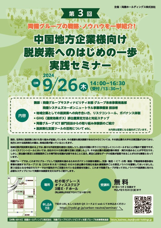 この度、 3回目となる「両備グループの戦略・ノウハウを一挙紹介!中国地方企業様向け脱炭素へのはじめの一歩実践セミナー」を、 2024年9月26日(木)中国地方の企業を対象に開催することになりました。 8月5日(月)より、セミナーにご参加いただける企業の募集を開始しましたのでお知らせいたします。