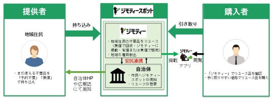ジモティースポットは、「不要になったけれどもまだ使えるモノ」を地域のコミュニティ内で有償または無償で譲り合うことが出来るサービスです。持ち込み希望の方は、ジモティースポットに持ち込むだけで、手軽に必要とする人に譲渡することができます。そして、譲り受け希望の方は、持ち込まれたモノの情報をジモティーで検索し、ジモティースポットで引き取ることでマッチングが成立する仕組みとなっています。