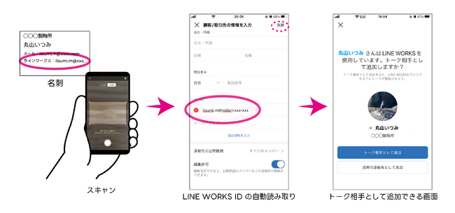 取引先や名刺交換をした人が「LINE WORKS」を使っているかわからない場合に、聞きづらかったり、確認する手間がかかったりしてしまうといったユーザーからの声がありました。名刺スキャン機能によって読み取りもしくはアドレス帳に直接入力・登録したメールアドレスと一致する「LINE WORKS」のユーザーIDが一人(1つ)だけ存在する場合、ワンタップでトークを開始することができるようになりました(双方の外部連携設定がONの場合のみ)。さらに、紹介用URLを使って「LINE WORKS」を新しく立ち上げた場合に、紹介者と被紹介者にサービス通知が届くようになり、ワンタップで双方が参加するトークルームを作成できるようになりました。