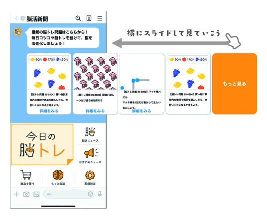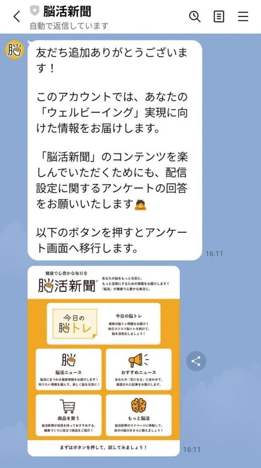 「ウェルビーイング実現に向けた情報をもっと手軽に届けたい」と、脳活新聞は、LINE公式アカウントをスタートしました。「友だち追加」をして気になるジャンルを設定すれば、欲しい情報が手元のスマートフォンなどに届くほか、今日の「脳トレ問題」はもちろん、過去の問題にも簡単にチャレンジできます。脳活新聞LINE特別コンテンツも配信中。生き生きとした毎日のためにぜひ、さまざまな便利機能を役立ててください。