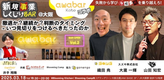 株式会社カスタメディア(本店:大阪府大阪市、代表取締役:宮崎耕史、以下 当社)が3月18日(火)18:30~大阪市にあるBlooming Camp(運営:さくらインターネット株式会社)にて『新規事業しくじりBAR Vol.2 -撤退か?継続か?判断のタイミング いつ見切りをつけるべきだったのか-』を開催します。