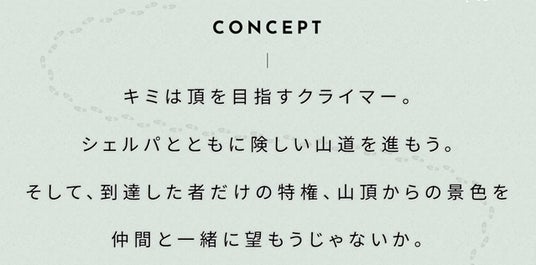 本アクセラレーションプログラムを実施するにあたり、挑戦者を「クライマー」、支援者を「シェルパ」と呼びます。Campsは個々の未知なる登山に挑むクライマー(挑戦者)へ以下のメッセージを捧げます。