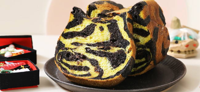 ほんのりビターなブラックココアを使用していますが、ねこねこ食パンの特徴のミルク100%を使用した生地と合わさり、ミルキーで甘みを感じられる味わいに仕上げています。また、チョコチップとラム酒漬けレーズンを練り込んでいるため、見た目だけでなく食感もお楽しみいただけます。新年のお祝いにぴったりな「ねこねこ食パン とら」をぜひご賞味ください。