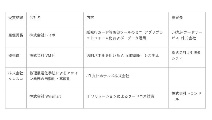 コンテストでは最優秀賞(1組)・優秀賞(2組)を選出し、受賞者には当該タスクを抱えるJR九州グループの企業と実証実験を行っていただきます。