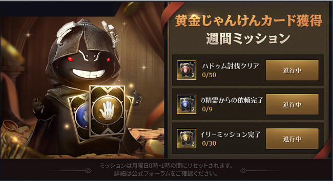 イベント期間中、ミッションをクリアすると、「闇の精霊と対決!じゃんけんぽん」イベントで通常より豪華な報酬が獲得できるかもしれない「黄金」じゃんけんカードを獲得することができます。詳細は以下URLをご確認ください。