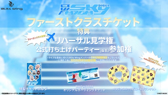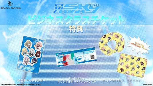 『ファーストクラスチケット』『ビジネスクラスチケット』をご購入の方には、Blitz Wing所属メンバーとの特別な空の旅を快適に過ごしていただくためのグッズを特典としてご用意。ラインナップは、航空チケットに見立てた「BWFes2024オリジナルボーディングチケット」や人気イラストレーターnokaさん書き下ろしの「オリジナルネックピロー&ブランケット」、「特製チケットホルダー」。