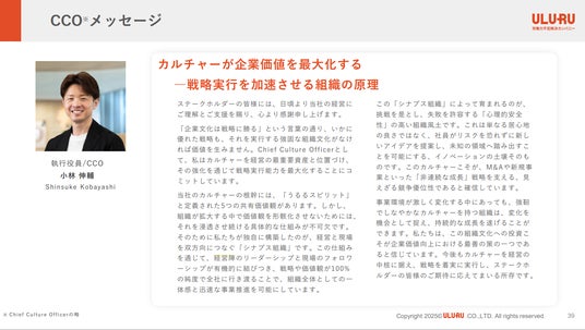 本報告書では、うるるの強みである「人と AI のハイブリッド型価値創造」と、中期経営方針「ULURU Sustainable Growth」の達成に向けた持続的な成長ストーリーを詳しく説明しています。2025 年度版では特に代表の星をはじめとする経営陣のコミットメントや、経営戦略と現場での実践を結びつけるための人材戦略「ULURU Sustainable Growth for Talent」の核となる課題を明示しています。