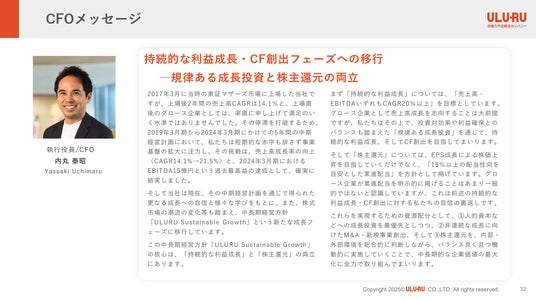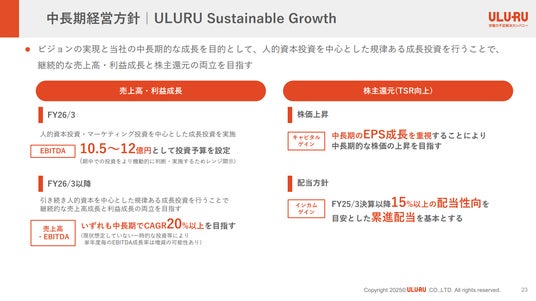 ビジョンの実現と中長期的な成長を目的として、人的資本投資を中心とした規律ある成長投資を行うことで、継続的な売上高・利益成長と株主還元の両立を目指す中長期経営方針「ULURU Sustainable Growth」を説明しています。