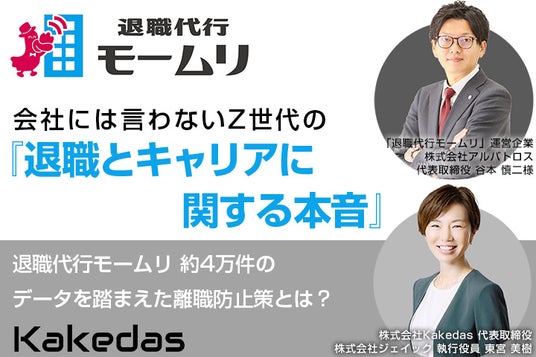 企業向けの教育研修事業と若年層向けの就職支援事業を展開する株式会社ジェイックの子会社である、国内最大級のキャリア面談プラットフォーム「Kakedas(カケダス)」を運営する株式会社Kakedasは、「退職代行モームリ」を運営する株式会社アルバトロス(本社:東京都品川区、代表取締役:谷本慎二)と共催し、7月31日(木)にオンラインにて、「会社には言わないZ世代の『退職とキャリアに関する本音』~退職代行モームリ約4万件のデータを踏まえた離職防止策とは?~」セミナーを開催します。