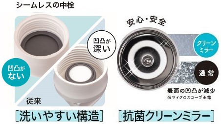 一体型になった事でパッキンの紛失や、付け外しの手間がなくなります。また、フタの内部の構造を見直し凹凸をなくしたため、スポンジ等が届きにくいすき間がなくなり洗いやすくなりました。内面は抗菌クリーンミラー加工を施し、においや汚れが付きにくくなってお手入れも簡単です。