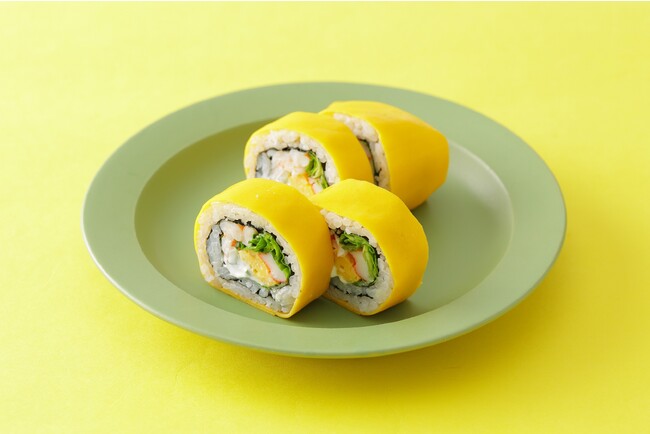 エビと野菜を錦糸玉子で巻き、マヨネーズで味付けしたお子様から大人まで美味しくいただける中太巻のサラダ巻です。