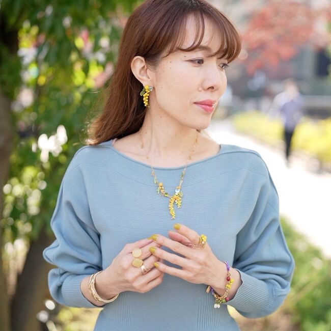 プロヴァンスの色とりどりのお花とクリスタル。光の洪水を巻き起こします!”Jardin de Provence”コレクションから、ミモザの枝が見事なイヤリングが到着しました。まるで本物かと見まごうばかりの鮮やかな彩色は、LesNereideメゾンだからこそなせる技。クリアブルーの大きなガラスビーズが目を引き、更に葉っぱにも小さなクリスタルがぜいたくに散りばめられました。時代を超えた美しさを備えたイヤリングです。