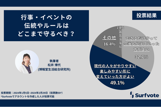 博報堂生活総合研究所、上席研究員の松井博代氏がSurfvoteで提起。「お正月の過ごし方」のような伝統・ルールを守る方がよいか?時代に合わせて変えていく方がよいか?Surfvoteで意見を集めました。