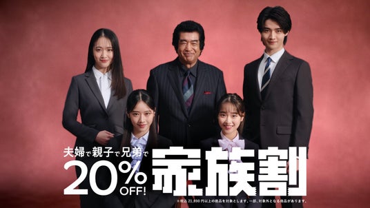 本CMは、あの名作がよみがえるような藤岡弘、さんの魂がこもった「変身!」という力強いセリフからスタート。お祝いや新しい門出のシーンをイメージさせるクラシックな名曲が流れる中、藤岡ファミリーのきょうだい達が鮮やかに回転!一瞬にして、大人っぽいスーツ姿へと変身します。かつてのヒーローをほうふつとさせる熱い演出と、現代の洗練されたスーツスタイルが融合した、躍動感あふれる映像は必見です。藤岡弘、さんが心を込めて発する「感謝」という言葉には、子どもの新しい門出を祝う愛情と、家族への感謝の気持ちを込めており、心温まるフィナーレとなっています。なお、CMの最後には、親子やきょうだいでの同時購入でお得になる「家族割」も訴求しています。