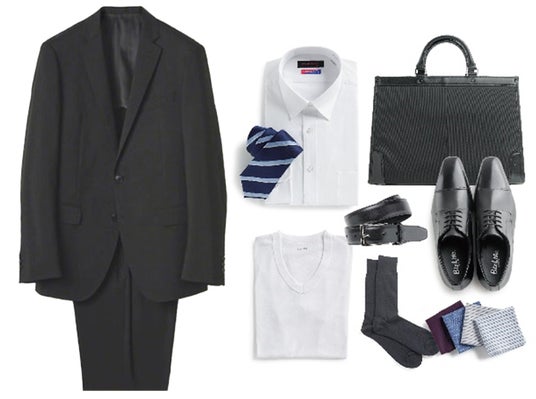 1.スーツ(21,890円)2.シャツ(4,389円)3.ネクタイ(4,389円)4.ベルト(4,389円)5.シューズまたはバッグ(10,989円)6.肌着(880円)7.靴下(880円)8.ハンカチ(880円)