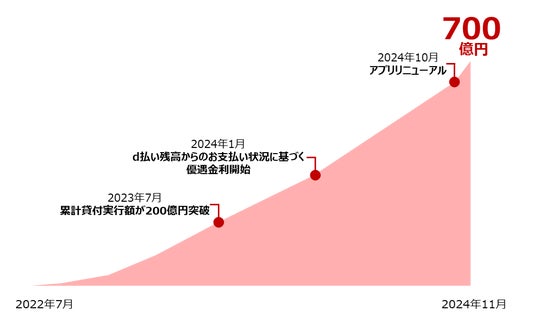 株式会社NTTドコモ(以下、ドコモ)が2022年7月20日(水)に提供を開始した、個人向けローンサービス「dスマホローン(R)」の累計貸付実行額が、サービス開始から約2年3か月で700億円を突破 (2024年11月時点)いたしました。