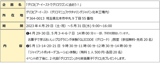 ※完全予約制です。詳細はHPをご確認ください。https://www.glico.com/jp/enjoy/experience/glicopia/east/
