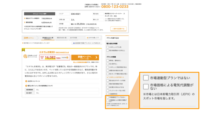 2、絞り込みフィルターに「市場連動型以外のプラン」「市場価格による電気代調整がない」を追加