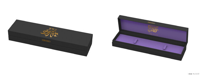 盤面やインデックスは、本作の舞台となる異世界“バイストン・ウェル”の世界観をイメージしたデザインで、盤面上部には本作に登場するキャラクター・チャムのシルエットをさりげなく配置し、“バイストン・ウェル”への通路・オーラロードやチャムの飛翔シーンをイメージしたラメを盤面全体に施しました。また、裏蓋には、40周年ロゴとシリアルナンバー(※)をレーザーマーキング。さらに、限定ボックスには作品ロゴと40周年ロゴを金の箔押し加工であしらい、40周年記念の豪華な仕様となっております。(※)シリアルナンバーはお選びいただけません。