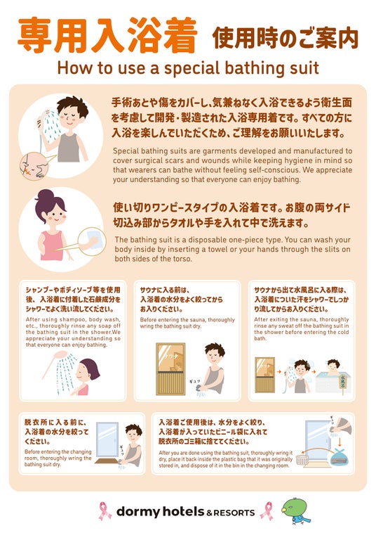 株式会社共立メンテナンス(以下、共立メンテナンス/代表取締役社長:中村 幸治/本社:東京都千代田区)は、入浴時に手術痕や治療痕、肌の露出に不安を感じるお客様の声を受け、これまでの専用入浴着の無料提供に加え、より多くのお客様に安心してご利用いただけるよう、運営する全国の「ドーミーイン」「共立リゾート」全140施設において、新たに大きいサイズの「オリジナル専用入浴着」の無料提供を開始いたしました。