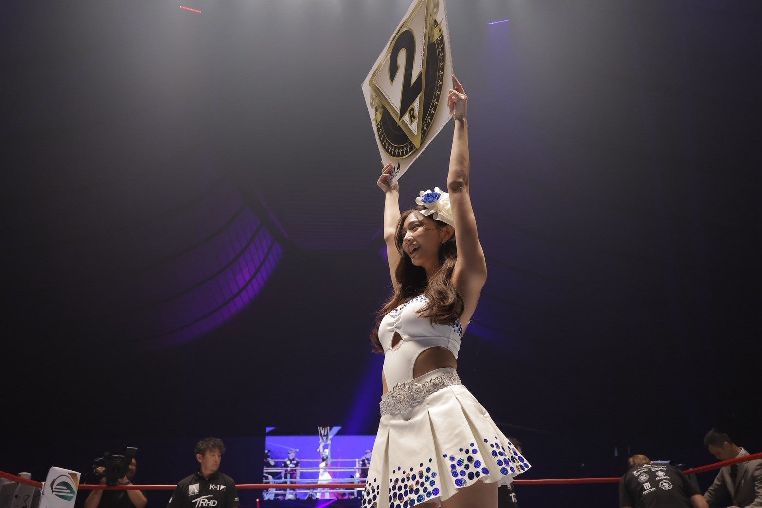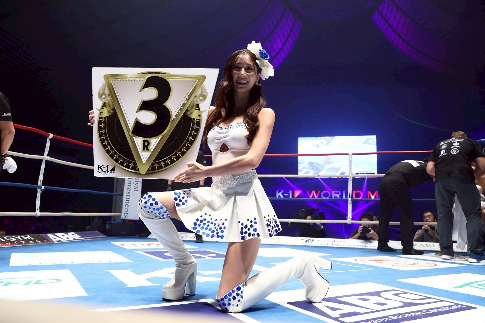 スペシャルラウンドガール時ではボードを持ったまま座るポーズをされており、このポーズについて「これは以前、熊田曜子さんがラウンドガールをされた時の動画を拝見して、そちらを予習してポージングやウォーキングなどを取り入れさせていただきました」と、先輩グラビアモデルでもある熊田曜子さんを参考にされたようでした。最後に、本日の試合の感想を伺うと、「貴重な機会にお招きいただき大変光栄でした。機会があれば、ぜひ今後もK-1ファミリーの一員として大会を盛り上げられたら嬉しいです。」とコメントを頂きました。