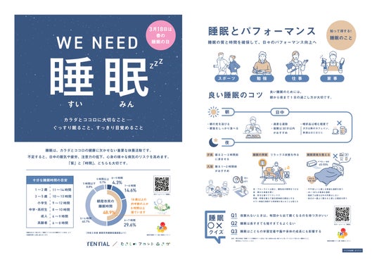 朝霞市とTENTIALによる初めての取り組みとして、働く世代の「睡眠による休養不足」という地域課題に対し、市民の睡眠リテラシー向上を目的に睡眠啓発ポスターを制作・掲載しました。単に睡眠時間の確保を促すだけでなく、入浴や寝室環境の整備といった「コンディショニング」の視点から具体的な手法を紹介。市役所や保健センター、市内小中学校等に掲示し、生活動線の中で専門知識に触れる機会を創出しています。