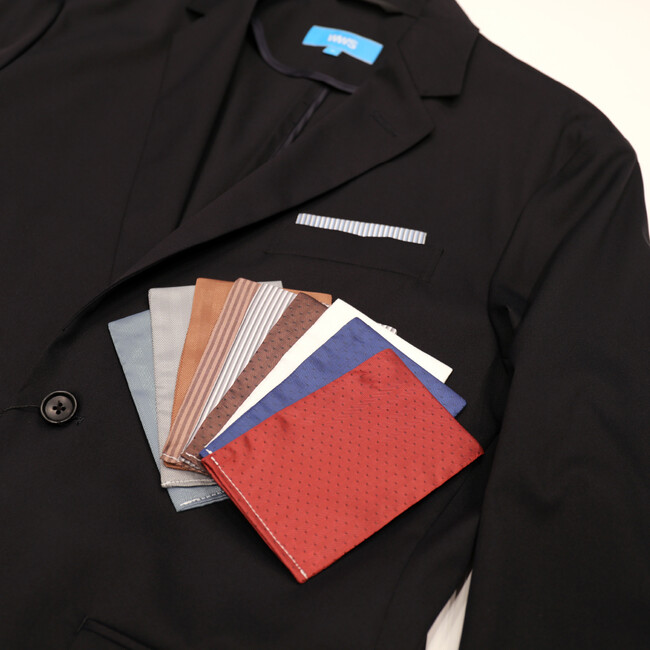 加工価格(税込):ジャケットフロント&フラワーボタン…1,320円/ジャケット袖口…1,650円/シャツボタン…1,980円/チーフ…1,650円