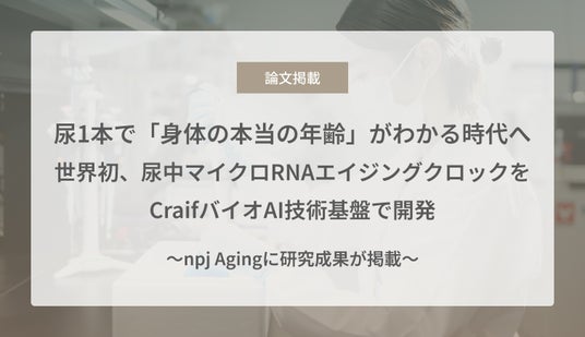 バイオAIスタートアップのCraif株式会社(本社:東京都新宿区、代表取締役CEO:小野瀬 隆一、以下Craif)は、尿中に含まれるマイクロRNA(miRNA)を独自のバイオAI技術基盤で解析し、生物学的年齢(=細胞レベルの老化度)を高精度に推定するエイジングクロックを開発しました。本研究成果は、2025年12月15日に老化や健康寿命延伸に関する国際学術誌 npj Aging に掲載されました。