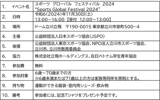スポーツを「する」「みる」「ささえる」ための環境づくりを行うJSPO(正式名称:公益財団法人日本スポーツ協会 東京都新宿区/会長 遠藤 利明)は、令和6(2024)年11月30日(土)に、ドーム立川立飛(東京都立川市)にて、マレーシアやベトナムといったアジア各国の日本に在留している外国人の方々と地域住民の方々がスポーツを通して交流するイベントを開催します。
