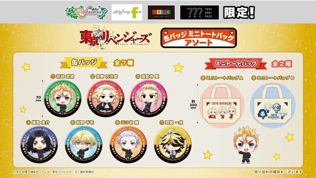 花垣武道(タケミチ)、佐野万次郎(マイキー)、龍宮寺堅(ドラケン)、場地圭介、松野千冬、三ツ谷隆、羽宮一虎のイラストがデザインされた缶バッジ・ミニバッグのアソート。価格:500円(税込)