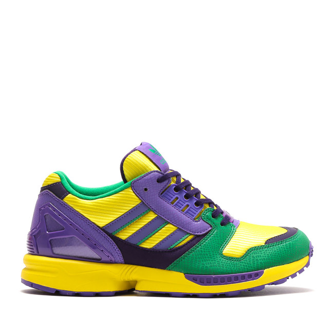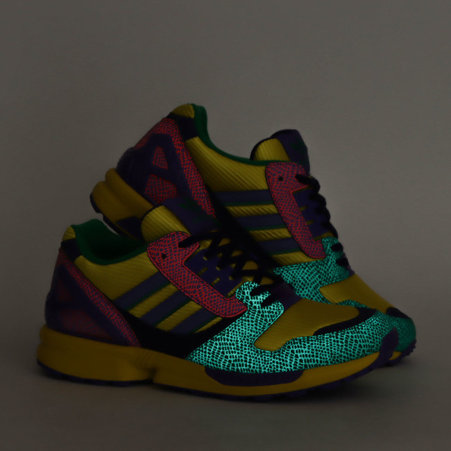 2001年に発売されたZX 8000 BRAZILをオマージュした本作は、当時用いられたカラーリングを忠実に再現しつつ、プラスチックヒールカップ部分には、オリジナルカラーであるグリーンをパープルへカラーチェンジ。そしてGLOW IN THE DARKを搭載したパーツ上に、大蛇がモチーフのスネークスキンパターンをリフレクティブ素材で細部に採用するなど、atmosならではのアップデートを施した一足となっております。
