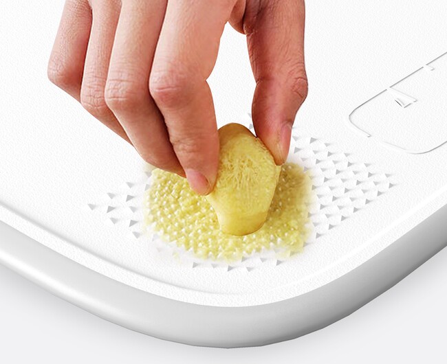 水切り穴付きのため、野菜等を切ったあとの水切りもラクに簡単にできます。その他、表面には薬味おろしや目盛り、汁こぼれ用のふちが、裏面には滑り止めがついており機能満載なまな板です。抗菌加工を施しているため衛生的、また食洗器にも対応しています。