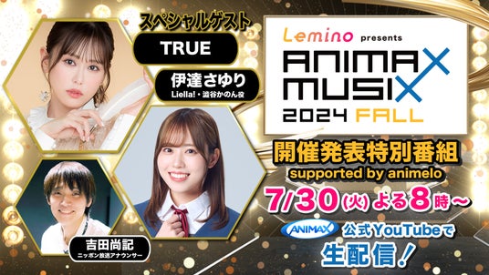 また、『Lemino presents ANIMAX MUSIX 2024 FALL』の開催を記念して、事前特別番組も生配信いたします。『ANIMAX MUSIX』でお馴染みのニッポン放送アナウンサー:吉田尚記の進行のもと、ゲストにTRUE、Liella!から澁谷かのん役の伊達さゆりをお迎えして、イベントの最新情報をお届けします。こちらもぜひご覧ください!