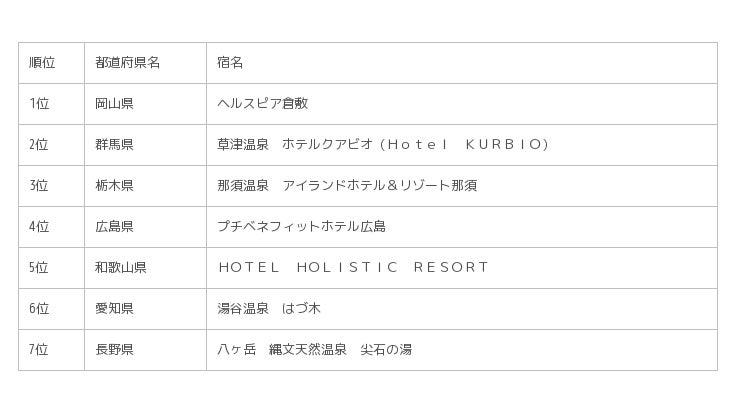 1位にランクインした「ヘルスピア倉敷」は有機栽培のにんじんを使用したにんじんジュースを飲みながら過ごすファスティングに特化した宿で、部屋着のまま部屋の中で横になって温浴をする「ラドン温浴」やストレッチ講座、ヨガ教室、ウォーキングなどプログラムが充実しており、人気を集めました。2位の「草津温泉 ホテルクアビオ(Hotel KURBIO)」は有機にんじんジュースを中心に自家製の梅干しや三年番茶、具なし味噌汁などを摂取して空腹感なくファスティングができるのが特徴で、美肌成分たっぷりの草津温泉の源泉が楽しめます。3位の「那須温泉 アイランドホテル&リゾート那須」は、自社農園で育てた野菜やフルーツを使ったジュースや、女性の管理栄養士が常駐して宿泊者の栄養や健康面をサポートするなど、安心してファスティングができて環境を整えています。