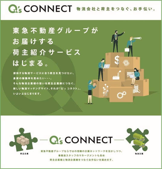 物流会社様と荷主企業様をつなぐ、新たなマッチングサービス「Q’sコネクト」の提供を、11月上旬に予定しております。「東急プラザ」をはじめとした当社が開発した商業施設の運営を行う「東急不動産SCマネジメント」、および東急グループが開発した商業施設をはじめとした様々な施設の運営を行う「東急モールズデベロップメント」、この2社ならではのネットワークを活用し、物流拠点再編や物流業務のアウトソーシングなどのニーズがある荷主企業様と、空坪リスクの解消や新たな取引先の創出でのお悩みの物流会社様とのマッチングを行うサービスになっております。