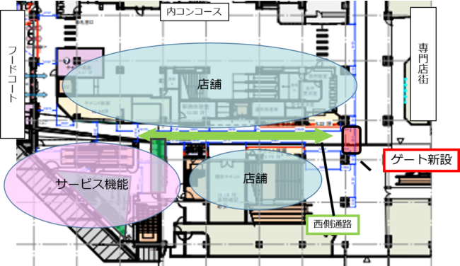 2階専門店街とフードコートを繋ぐ西側通路には、ATMコーナーやピックアップロッカーなどを設置するほか、テイクアウトに特化した店舗を誘致するなど、アフターコロナの消費者ニーズの変化をとらえた駅ならではのサービス機能を充実させます。